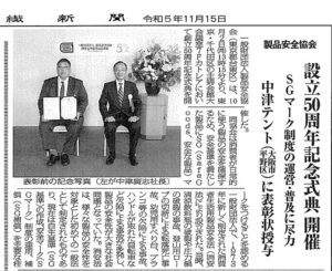 一般財団法人製品安全協会(東京都台東区)の設立50周年記念式典において、中津テントはSG(Safe Goods、安全な製品)マーク制度の運営・普及等において、顕著な実績が認められ表彰されました。一般運動用マット、イベント […]